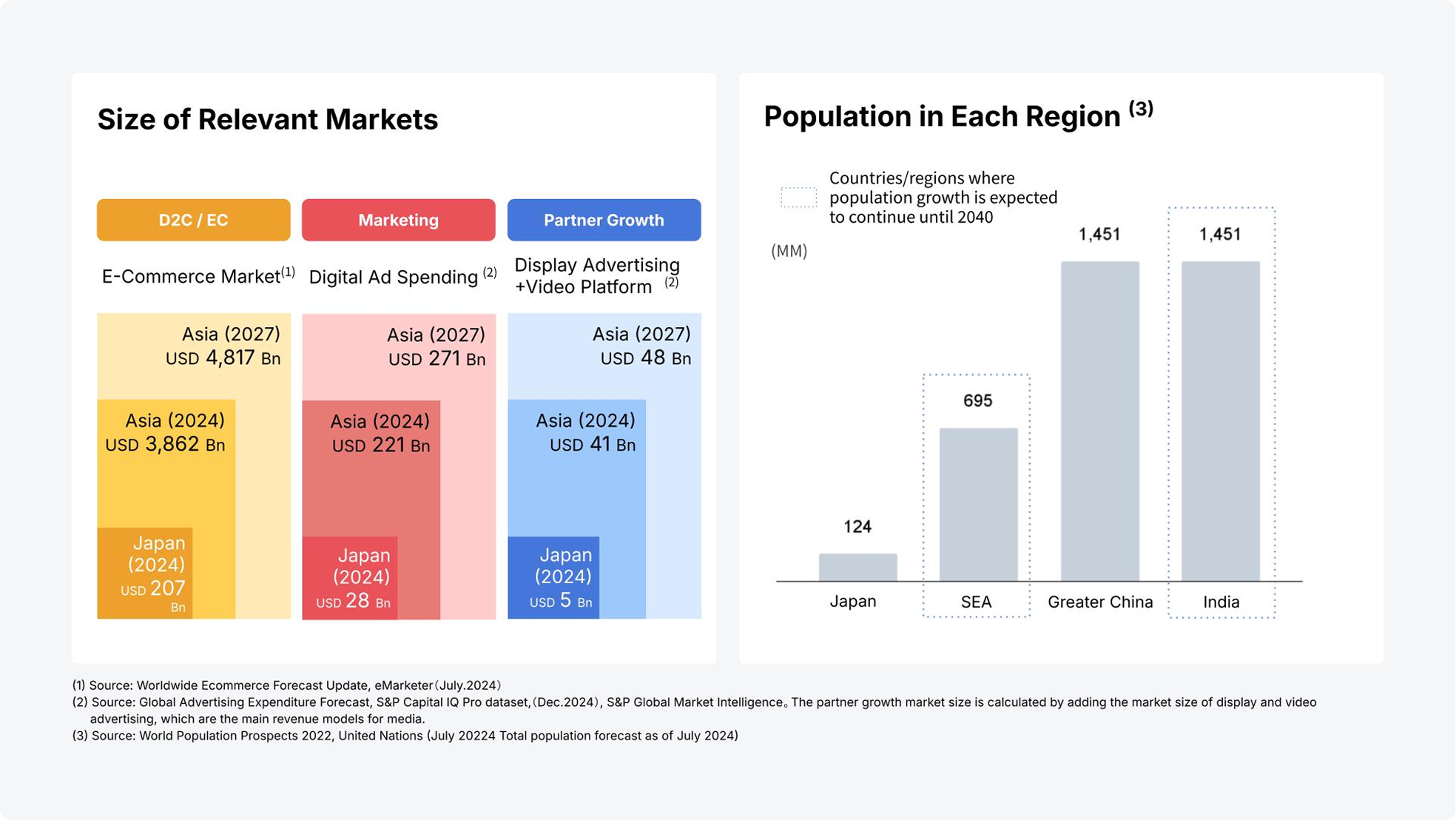 Since our founding in Singapore in 2016, we have been developing our business targeting the market of over 4 billion people in Asia. In Asia, the population is expected to continue growing over the medium to long term, and sustained economic growth can be anticipated. By focusing on these growth markets, we aim to achieve continuous business growth and become "Asia's leading technology company" in the commerce sector.