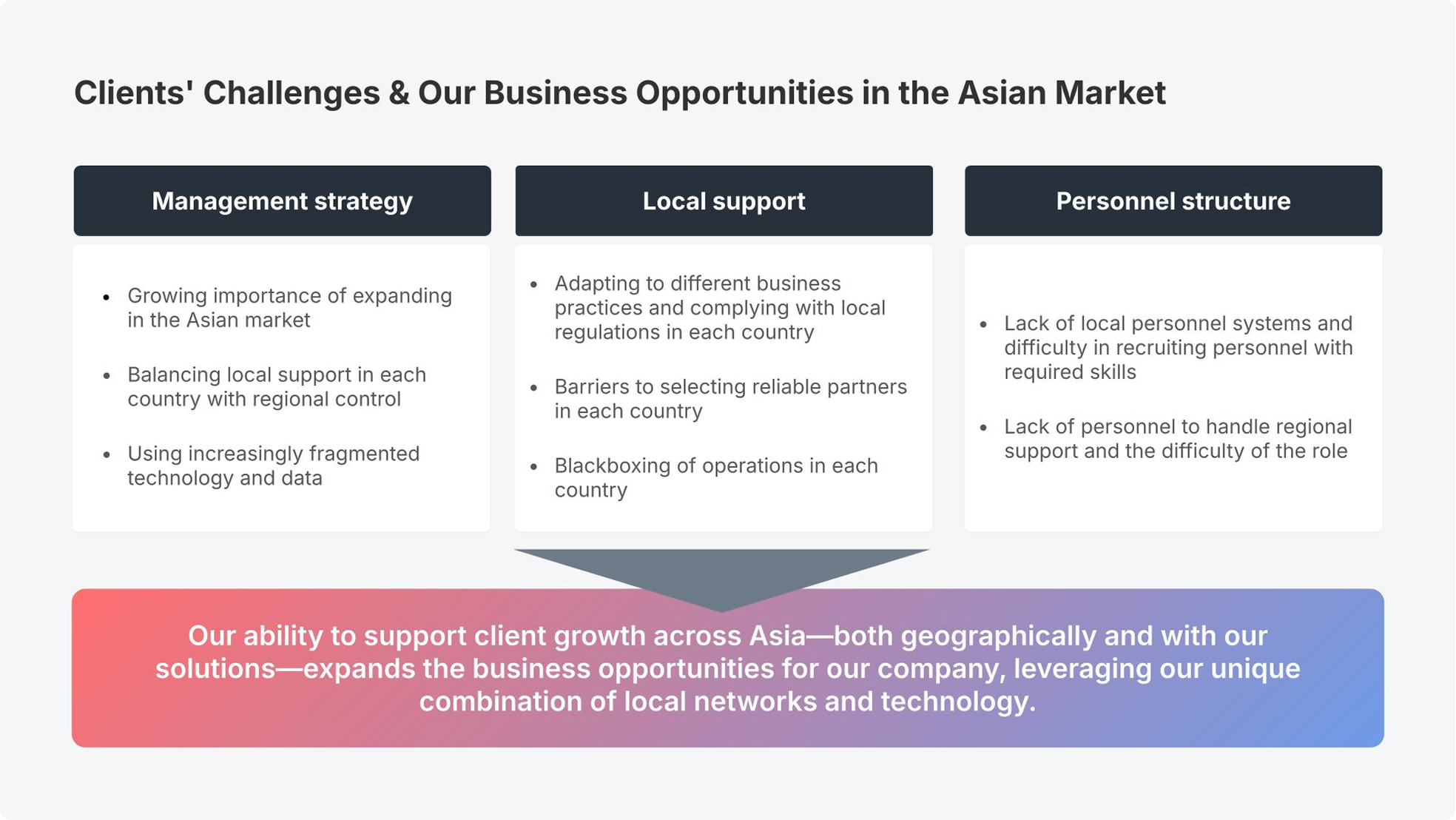 On the other hand, we believe that many companies face hurdles in advancing their business in Asia due to differing local business practices and regulations in each Asian country, the difficulty of selecting reliable local partners in each country, and shortages of personnel and resources both locally and regionally.