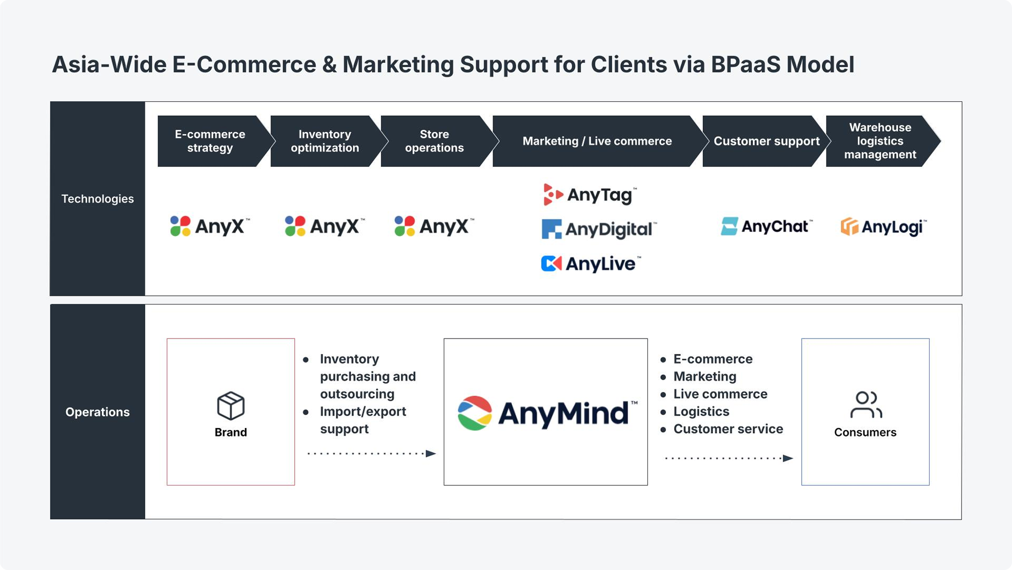 Our business opportunities are increasing as we can provide support across Asia for such challenges faced by customers, with products and solutions that cover the entire business process. We will expand our business to leverage our network of bases and connections spread across Asia, establishing recognition as "the go-to company for cross-border e-commerce business and growth support in Asia - AnyMind," and achieving the No.1 position in Asia.
