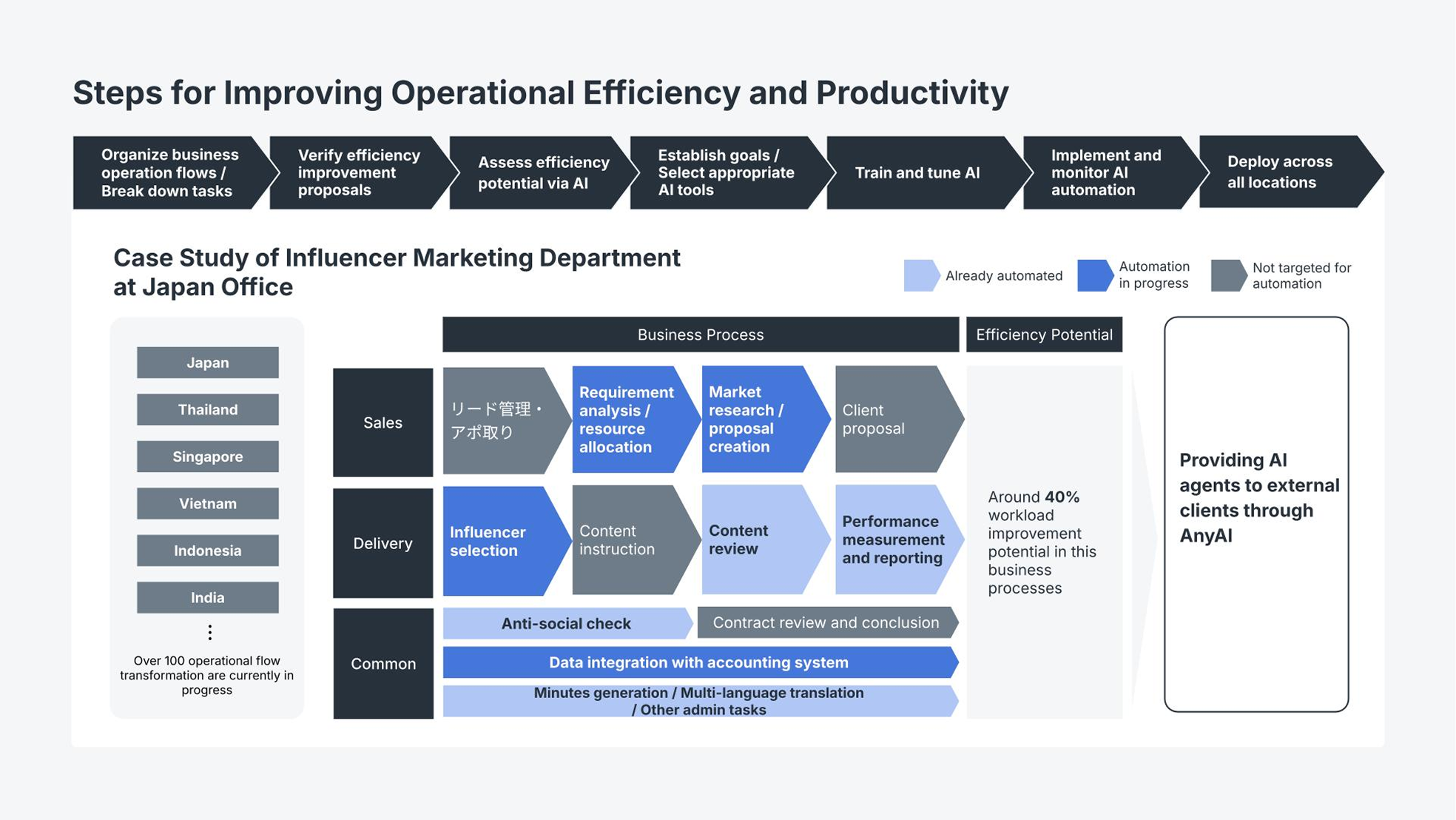 For example, in our influencer marketing division in Japan, we have introduced AI across various processes including sales proposal creation, influencer selection, post checking, and performance measurement, achieving both efficiency improvements and quality enhancement. We also utilize AI for common tasks such as meeting minutes creation and translation, leading to significant time savings.