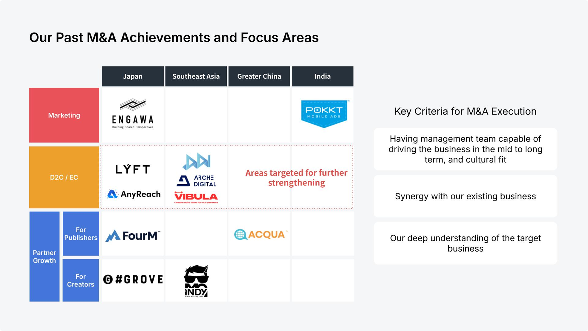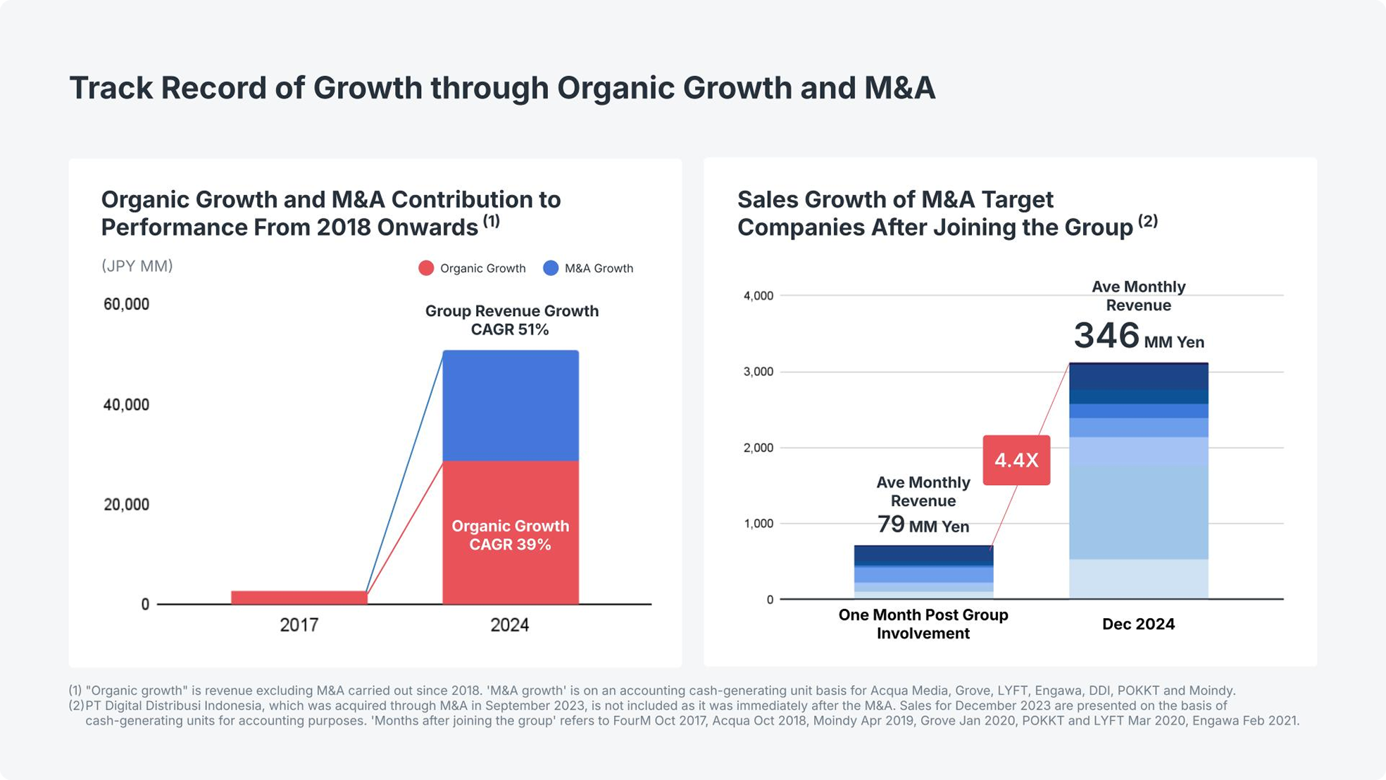 We have executed acquisitions of over 10 companies both domestically and internationally in Japan. In addition to high organic growth, we strategically leverage M&A to pursue operational excellence and acquire outstanding management talent, further accelerating the business development of our entire group.