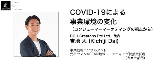 まず、吉地氏は全世界そしてアジアでのコロナウイルス流行の推移について話した後に、それらが巻き起こしたコンシューマービジネスにおける変化やアジアで起きている現象などについて触れ、ネットビジネスのさらなる加速や旧来型のビジネス破綻の可能性などを事例と共に紹介しました。